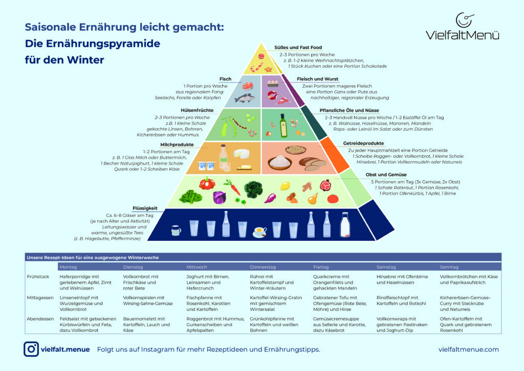 Wie auch die Pyramiden für Frühling, Sommer und Herbst wird die Winterpyramide durch einen konkreten Wochenplan ergänzt. Von Haferporridge mit Apfel am Montag über Linseneintopf mit Wurzelgemüse, Kartoffel-Wirsing-Gratin und Grünkohlpfanne bis zum Kichererbsen-Curry mit Steckrübe am Sonntag – der Plan zeigt, wie sich saisonale Ernährung im Alltag umsetzen lässt.